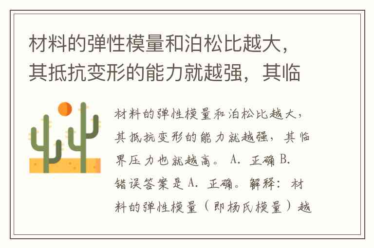 解释:材料的弹性模量(即杨氏模量)越大,表示该材料在受到应力作用时,能更好地抵抗形变,表现出更强的刚性。泊松比表示材料在拉伸或压缩方向上的变形程度,泊松比越大,表示材料在某一方向上的变形会引起其他方向的变形。因此,材料的弹性模量和泊松比越大,其抵抗变形的能力确实越强,通常也意味着材料能够承受更高的临界压力。