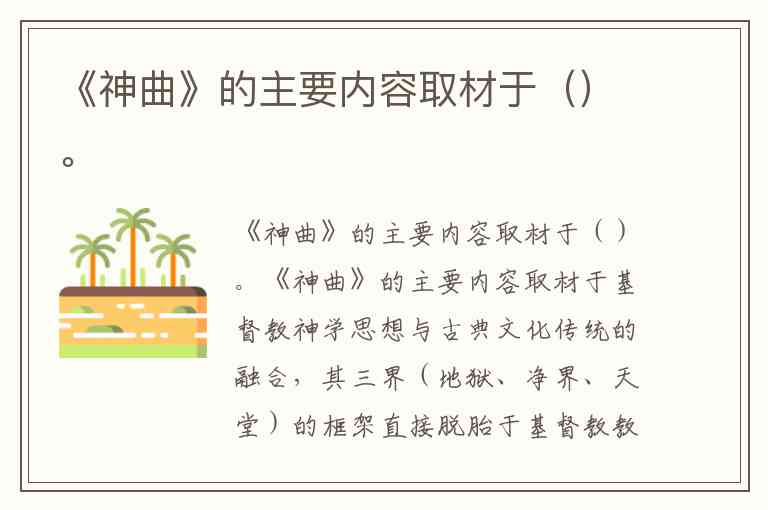 《神曲》的主要内容取材于基督教神学思想与古典文化传统的融合,其三界(地狱、净界、天堂)的框架直接脱胎于基督教教义,同时吸收了古希腊罗马文学元素与中世纪经院哲学概念。
