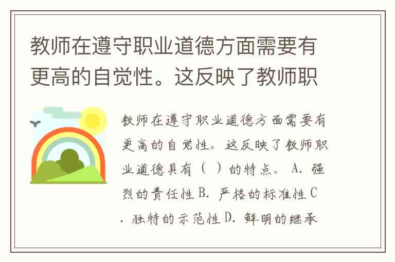 教师在遵守职业道德方面需要有更高的自觉性。这反映了教师职业道德具有( )的特点。 A. 强烈的责任性 B. 严格的标准性 C. 独特的示范性 D. 鲜明的继承性