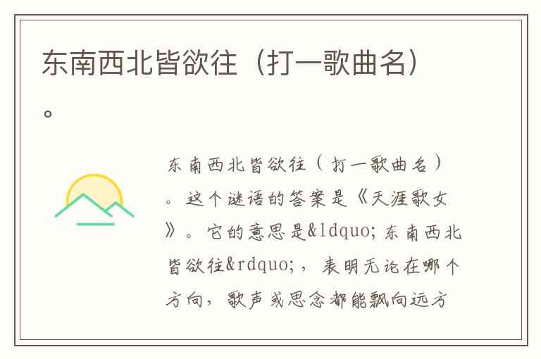 这个谜语的答案是《天涯歌女》。它的意思是“东南西北皆欲往”,表明无论在哪个方向,歌声或思念都能飘向远方,这正与《天涯歌女》中的主题呼应,表达了漂泊在外的女子心中对故乡的深深思念。