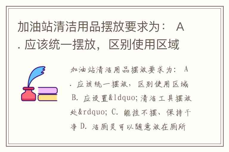 加油站清洁用品摆放要求为: A. 应该统一摆放,区别使用区域 B. 应设置“清洁工具摆放处” C. 能挂不摆、保持干净 D. 洁厕灵可以随意放在厕所任何位置