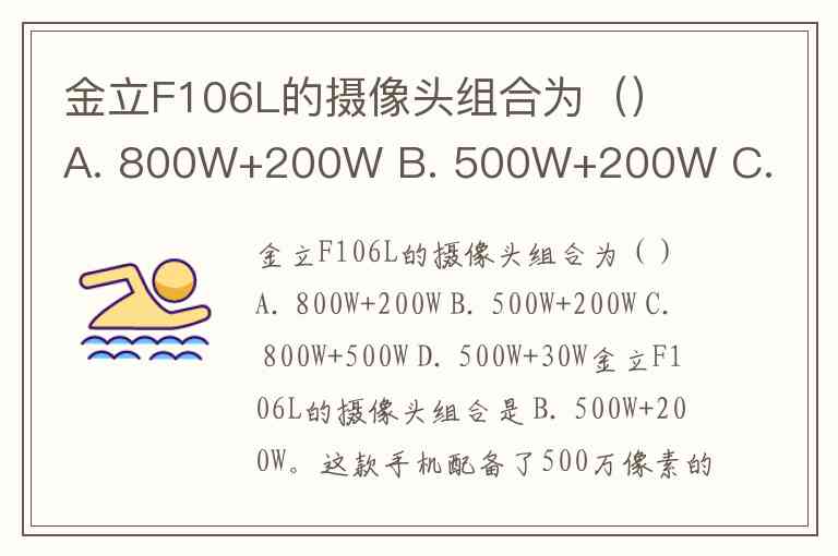 金立F106L的摄像头组合为() A. 800W+200W B. 500W+200W C. 800W+500W D. 500W+30W
