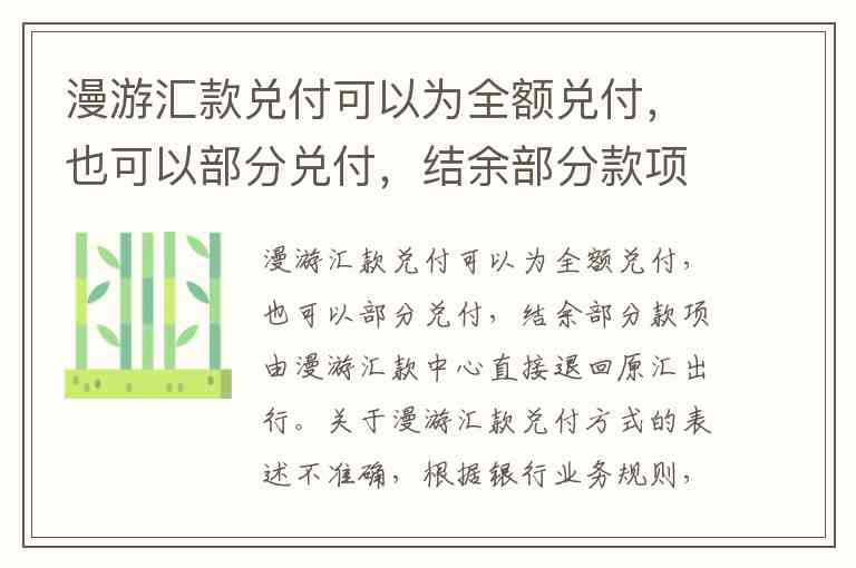 漫游汇款兑付可以为全额兑付,也可以部分兑付,结余部分款项由漫游汇款中心直接退回原汇出行。