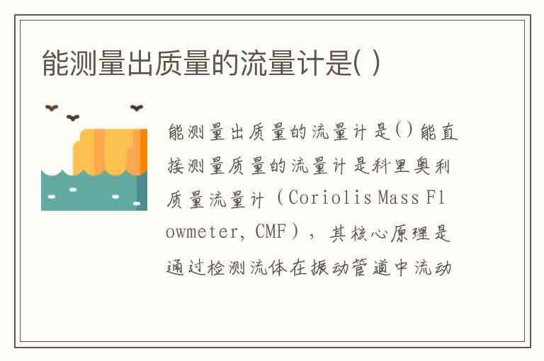 能直接测量质量的流量计是科里奥利质量流量计(Coriolis Mass Flowmeter, CMF),其核心原理是通过检测流体在振动管道中流动时产生的科里奥利力,直接输出质量流量值(单位如kg/h),无需依赖密度、温度或压力补偿。
