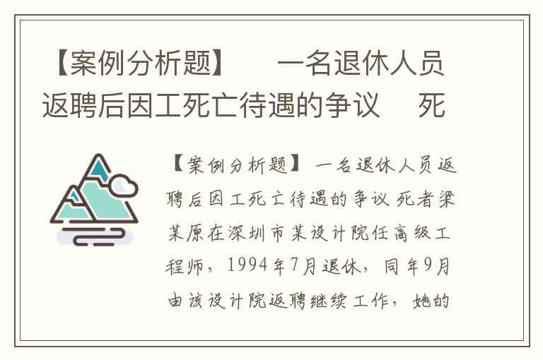 【案例分析题】 一名退休人员返聘后因工死亡待遇的争议 死者梁某原在深圳市某设计院任高级工程师,1994年7月退休,同年9月由该设计院返聘继续工作,她的丈夫还是该设计院的副总工程师。当时她同设计院双方约定,梁某如因工致残、死亡,按正式员工的待遇处理。当月梁某因公到广州出差,遇车祸死亡。经该设计院、设计院主管单位某总公司以及死者的亲属与交通肇事者交涉,肇事者赔偿梁某亲属10.6万元。该设计院及其主管单位共同对梁某的死亡待遇作出如下处理:第一,让梁某的长女曹某到市社会保险管理局按退休员工死亡的保险标准领取抚恤金4338元,丧葬补助费2037元;第二,垫付治丧期间梁某亲属的机票费、治丧费10091.6元;第三,给梁某亲属补助12000元,并扣除已垫付的机票费、治丧费,实付其亲属补助200O元。曹某对此处理不服,向当地劳动争议仲裁机构提出申诉请求:第一,梁某的死亡应按因工死亡处理,用人单位应补差(现待遇与因工死亡待遇之差);第二,根据深圳市有关工伤保险的规定,梁某的直系亲属包括其父母亲(侨居海外)、子女(最小的次女已满18周岁)。这些人应享受抚养生活补助费。 仲裁结果: 1.该设计院补发申诉人的抚恤金、丧葬费差额11000元,差额一年期利息1000元; 2.该设计院主管单位——某总公司负连带责任; 3.驳回申诉人抚养梁某父亲、母亲、次女的申诉请求; 4.仲裁费490元,申诉人承担190元,被诉人承担300元。 问题:申诉人的申诉和仲裁机构的裁决是否合理?请用劳动保障的有关理论分析。
