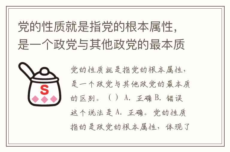 党的性质就是指党的根本属性,是一个政党与其他政党的最本质的区别。() A. 正确 B. 错误
