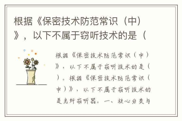 2023年保密教育线上培训考试明确将“间谍卫星拍照”列为非窃听技术选项,其逻辑与本题一致:不属于声学或电磁信号窃听的技术均不在分类范围内。光纤窃听器虽具备窃密功能,但其“光纤信号监测”的技术路径超出了《保密技术防范常识(中)》界定的四类传统窃听技术范畴。