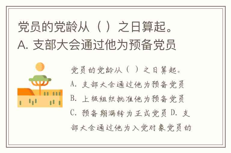党员的党龄从( )之日算起。 A. 支部大会通过他为预备党员 B. 上级组织批准他为预备党员 C. 预备期满转为正式党员 D. 支部大会通过他为入党对象
