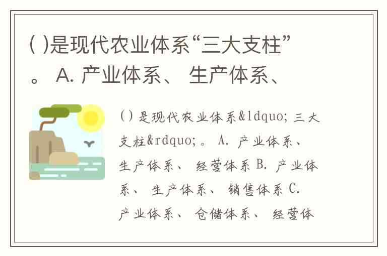( )是现代农业体系“三大支柱”。 A. 产业体系、 生产体系、 经营体系 B. 产业体系、 生产体系、 销售体系 C. 产业体系、 仓储体系、 经营体系 D. 产业体系、 生产体系、 加工体系
