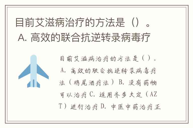 目前艾滋病治疗的方法是()。 A. 高效的联合抗逆转录病毒疗法(鸡尾酒疗法) B. 没有药物可以治疗 C. 适用齐多夫定(AZT)进行治疗 D. 中医中药治疗