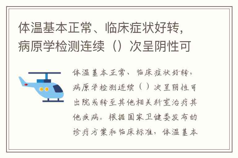 体温基本正常、临床症状好转,病原学检测连续()次呈阴性可出院或转至其他相关科室治疗其他疾病。