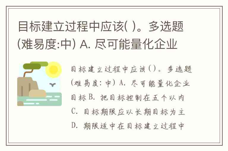 目标建立过程中应该( )。多选题(难易度:中) A. 尽可能量化企业目标 B. 把目标控制在五个以内 C. 目标期限应以长期目标为主 D. 期限适中