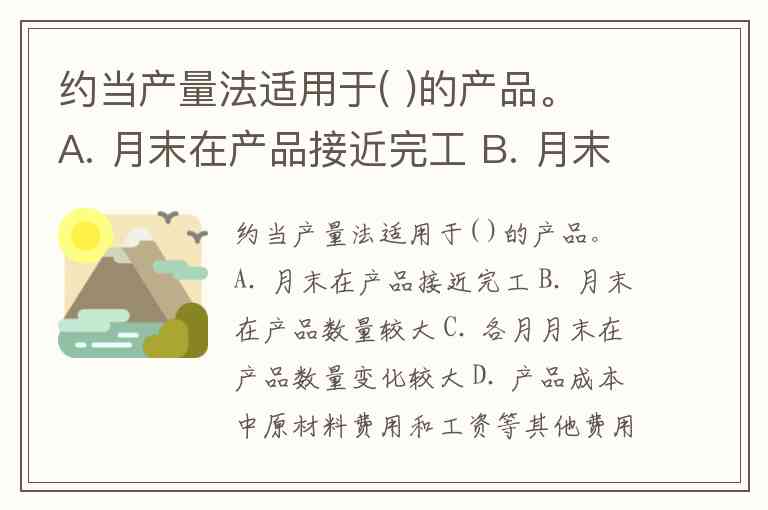 约当产量法适用于( )的产品。 A. 月末在产品接近完工 B. 月末在产品数量较大 C. 各月月末在产品数量变化较大 D. 产品成本中原材料费用和工资等其他费用比重相差不大