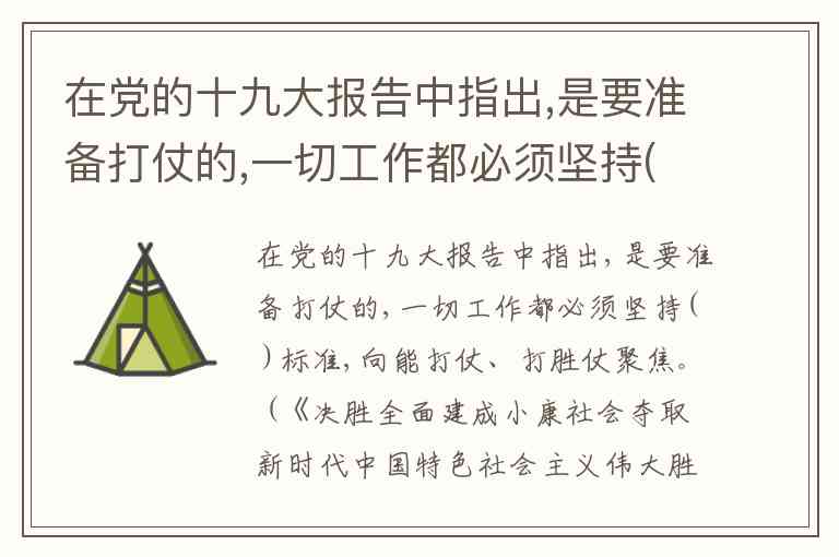 在党的十九大报告中指出,是要准备打仗的,一切工作都必须坚持( )标准,向能打仗、打胜仗聚焦。 (《决胜全面建成小康社会夺取新时代中国特色社会主义伟大胜利一一在中国第十九次全国代表大会上的报告》,《坚持走中国特色强军之路,全面推进国防和现代化》,人民出版社,2017年10月版,第54页) A. 战斗力 B. 斗争力 C. 战争力 D. 硬实力