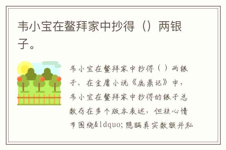 在金庸小说《鹿鼎记》中,韦小宝在鳌拜家中抄得的银子总数存在多个版本表述,但核心情节围绕“隐瞒真实数额并私吞部分财产”展开。根据原著细节与主流解读,实际抄得总数为235万余两,韦小宝最终分得45万两,这一数额成为其早期积累财富的关键起点。