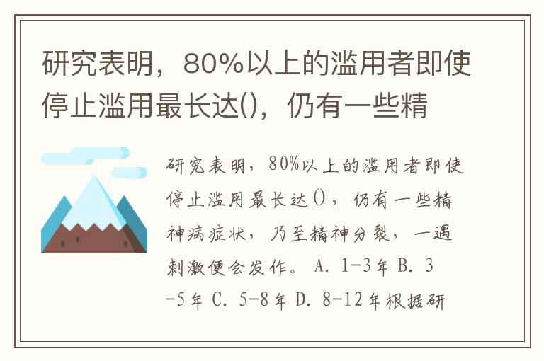 研究表明,80%以上的滥用者即使停止滥用最长达(),仍有一些精神病症状,乃至精神分裂,一遇刺激便会发作。 A. 1-3年 B. 3-5年 C. 5-8年 D. 8-12年