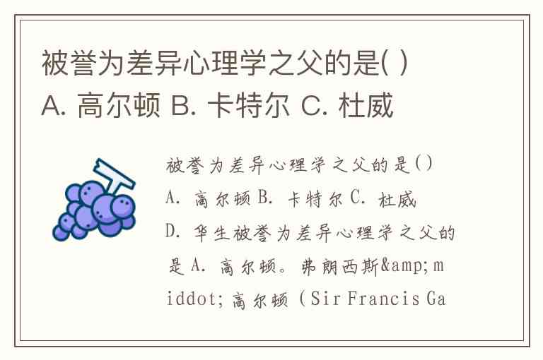 被誉为差异心理学之父的是( ) A. 高尔顿 B. 卡特尔 C. 杜威 D. 华生