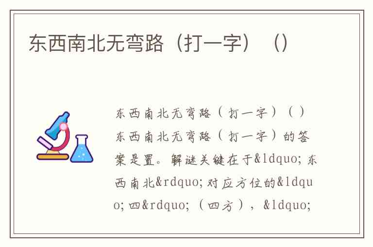 解谜关键在于“东西南北”对应方位的“四”(四方),“无弯路”暗示“直”——将“四”与“直”组合,便构成“置”字。这一拆字逻辑既包含方位元素,又体现对“弯路”的否定(直),符合汉字字谜“形义结合”的特点。