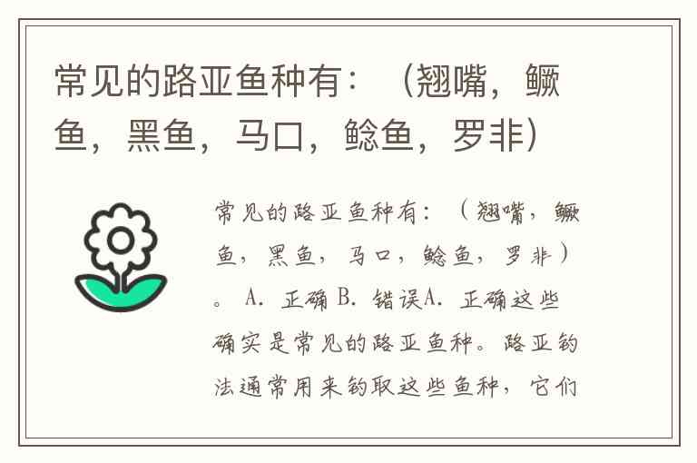 常见的路亚鱼种有:(翘嘴,鳜鱼,黑鱼,马口,鲶鱼,罗非)。 A. 正确 B. 错误