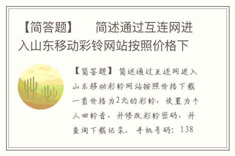 【简答题】 简述通过互连网进入山东移动彩铃网站按照价格下载一首价格为2元的彩铃,设置为个人回铃音,并修改彩铃密码,并查询下载记录。 手机号码:13863548811、密码:111111