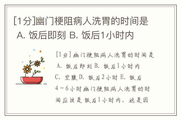 [1分]幽门梗阻病人洗胃的时间是 A. 饭后即刻 B. 饭后1小时内 C. 空腹 D. 饭后2小时 E. 饭后4~6小时
