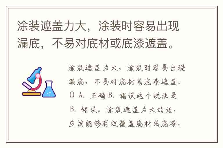 涂装遮盖力大的话,应该能够有效覆盖底材或底漆,减少漏底的情况。涂装遮盖力大,通常意味着涂料的覆盖性强,可以很好地遮住底层表面,不易出现漏底现象。因此,这个描述是不准确的。