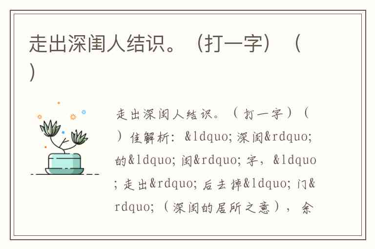 解析:“深闺”的“闺”字,“走出”后去掉“门”(深闺的居所之意),余下“圭”;“人结识”即“圭”与“人”结合,组成“佳”。“佳”字既呼应“人”的相遇(结识),又含美好之意,贴合谜面逻辑。