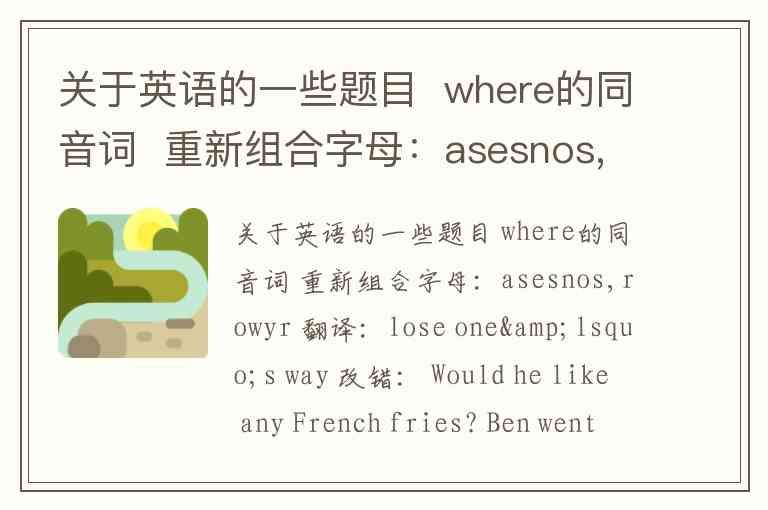 关于英语的一些题目 where的同音词 重新组合字母:asesnos,rowyr 翻译:lose one‘s way 改错: Would he like any French fries? Ben went to there by boat last summer. 根据首字母补全单词,使句意完整 Mei ling looks upset.What’s wrongwith her? D----- she l------ s--------. 连词成句 Jim,go,where,your,did,family,last,summer twelve的序数词
