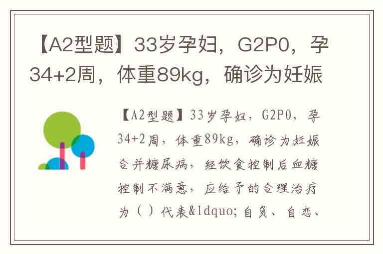 【A2型题】33岁孕妇,G2P0,孕34+2周,体重89kg,确诊为妊娠合并糖尿病,经饮食控制后血糖控制不满意,应给予的合理治疗为()