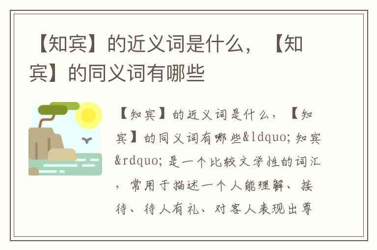 对于“知宾”这个词,其近义词和同义词可以根据其含义分为以下几类: