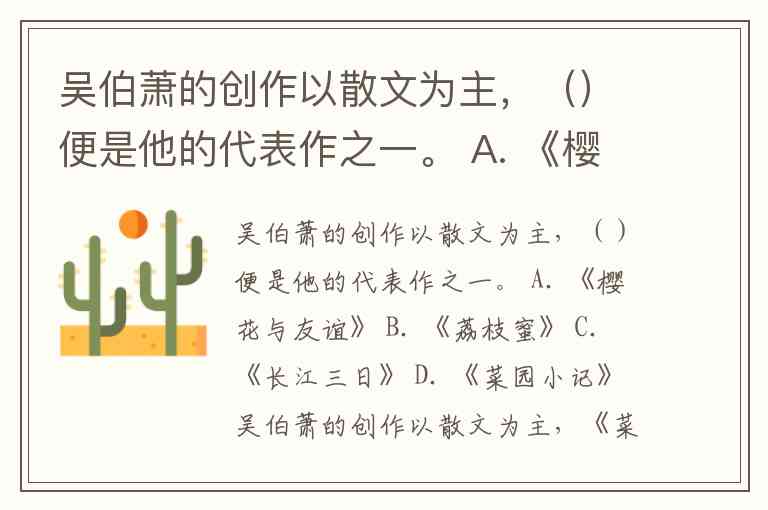 吴伯萧的创作以散文为主,()便是他的代表作之一。 A. 《樱花与友谊》 B. 《荔枝蜜》 C. 《长江三日》 D. 《菜园小记》