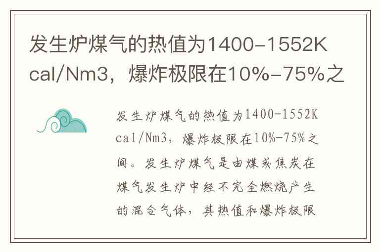 发生炉煤气的热值为1400-1552Kcal/Nm3,爆炸极限在10%-75%之间。