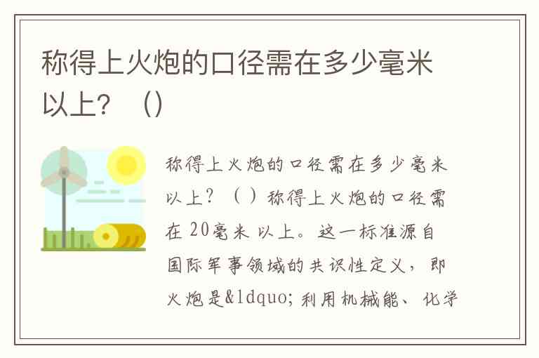 称得上火炮的口径需在 20毫米 以上。这一标准源自国际军事领域的共识性定义,即火炮是“利用机械能、化学能等能源抛射弹丸,口径不小于20毫米的身管射击武器”。例如,联合国裁军事务办公室2016年工作手册虽未直接定义“火炮”,但明确将20毫米作为“最小火炮弹药”的口径起点。