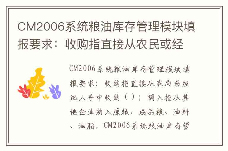 CM2006系统粮油库存管理模块填报要求:收购指直接从农民或经纪人手中收购();调入指从其他企业购入原粮、成品粮、油料、油脂。