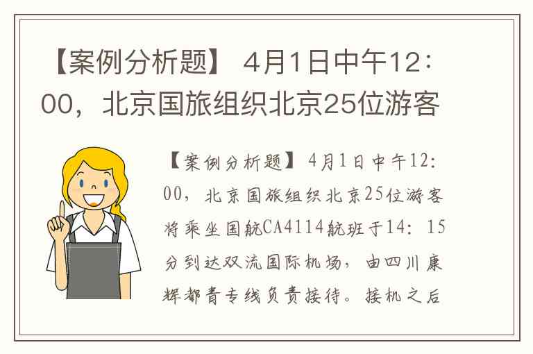 【案例分析题】 4月1日中午12:00,北京国旅组织北京25位游客将乘坐国航CA4114航班于14:15分到达双流国际机场,由四川康辉都青专线负责接待。接机之后入住成都金星大酒店,在酒店用餐,4月2日游览都江堰青城山,晚上入住成都金星大酒店,4月3日游览武侯祠、杜甫草堂,晚上入住成都金星大酒店。4月4日早上8:00乘坐国航CA4113离开成都,返回北京。各种费用如下: 住宿费:每晚每间200元。 成都市区到机场:接机每人50元,送机每人50元 门票:都江堰90、青城山90、武侯祠60、杜甫草堂60 包车:每天租车价格为1500元,按照2天计算 餐:餐标均为50元,酒店含早 地陪:每天500元,按照2天计算 机票:北京到成都往返均为5折,全价1440,机场建设费50,燃油税120 全陪:总计2500元 北京市区到机场:送机60,接机60 组团社购买保险,每人10元(地接社不买) 请你根据以上信息完成下列事项:(要求列出各项详细费用的计算步骤) 简述国内接待计调操作流程。