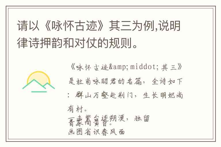 结论:《咏怀古迹·其三》完美体现了律诗押韵平仄统一、对仗工稳灵活的核心规则,同时证明了格律并非束缚,而是诗人构筑意境、深化情感的艺术手段。