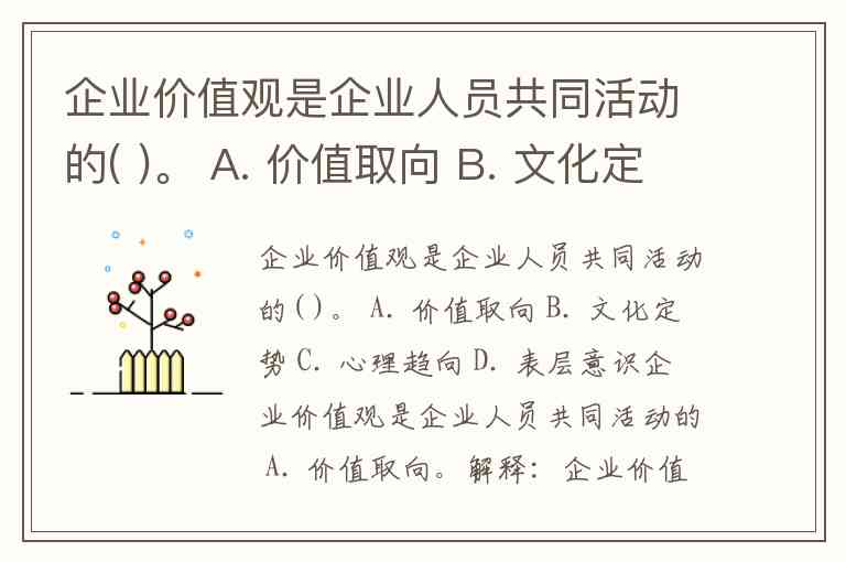 企业价值观是企业人员共同活动的( )。 A. 价值取向 B. 文化定势 C. 心理趋向 D. 表层意识