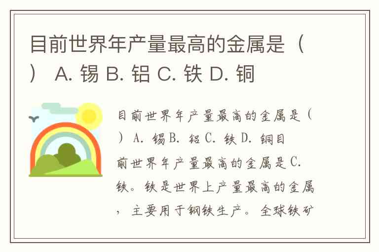 目前世界年产量最高的金属是 C. 铁。