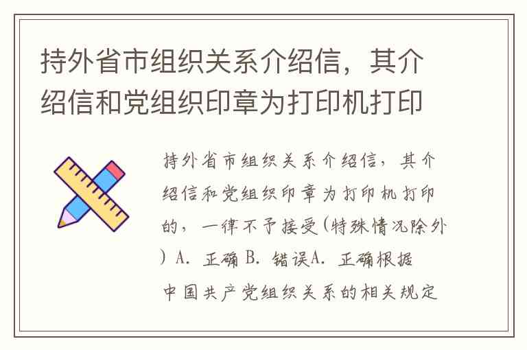 根据中国共产党组织关系的相关规定,外省市的组织关系介绍信通常要求是由党组织亲自手写或盖章,且不得为打印版。这是为了确保其真实性和正式性,防止伪造。若有特殊情况,可能会有例外。