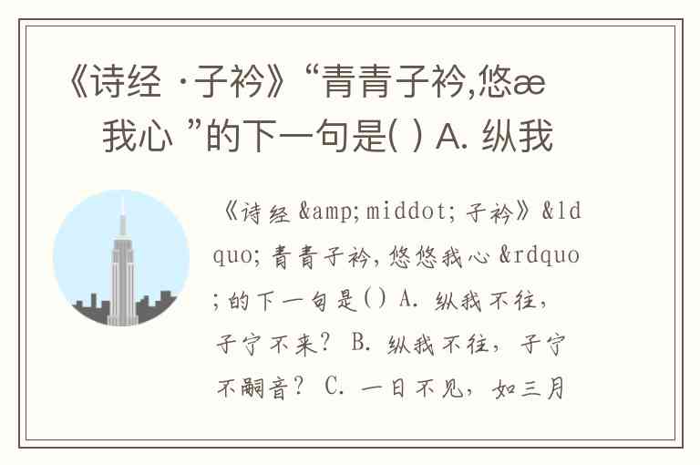 《诗经 ·子衿》“青青子衿,悠悠我心 ”的下一句是( ) A. 纵我不往,子宁不来? B. 纵我不往,子宁不嗣音? C. 一日不见,如三月兮。 D. 青青子衿,悠悠我思。