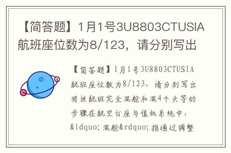 【简答题】1月1号3U8803CTUSIA航班座位数为8/123,请分别写出将该航班完全混舱和混4个头等的步骤
