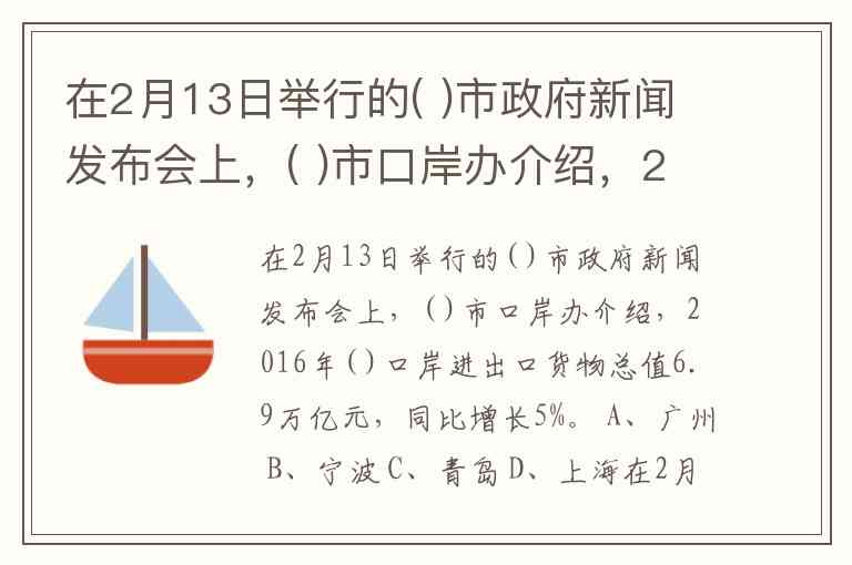 在2月13日举行的( )市政府新闻发布会上,( )市口岸办介绍,2016年( )口岸进出口货物总值6.9万亿元,同比增长5%。 A、广州 B、宁波 C、青岛 D、上海