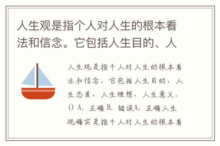 人生观是指个人对人生的根本看法和信念。它包括人生目的、人生态度、人生理想、人生意义。() A. 正确 B. 错误