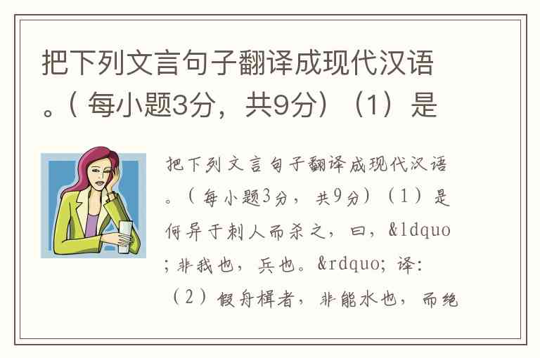 把下列文言句子翻译成现代汉语。( 每小题3分,共9分) (1)是何异于刺人而杀之,曰,“非我也,兵也。” 译: (2)假舟楫者,非能水也,而绝江河。 译: (3)外连横而斗诸侯。 译: