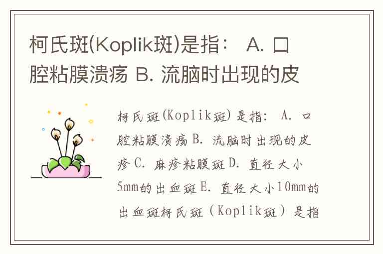柯氏斑(Koplik斑)是指: A. 口腔粘膜溃疡 B. 流脑时出现的皮疹 C. 麻疹粘膜斑 D. 直径大小5mm的出血斑 E. 直径大小10mm的出血斑