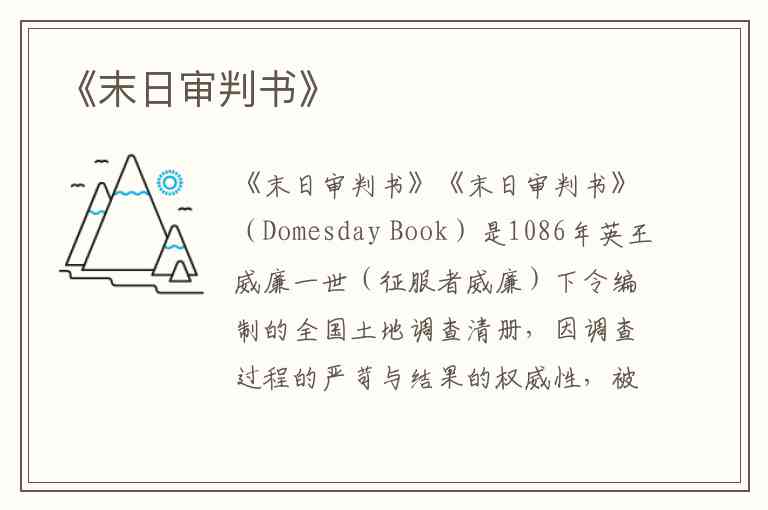 《小末日审判书》(Little Domesday):仅包含埃塞克斯、诺福克、萨福克三郡,细节更详尽(如单块土地的历任所有者),因未及最终整理而独立成册。