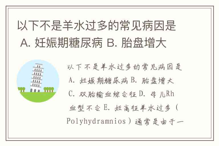 以下不是羊水过多的常见病因是 A. 妊娠期糖尿病 B. 胎盘增大 C. 双胎输血综合征 D. 母儿Rh 血型不合 E. 妊高征