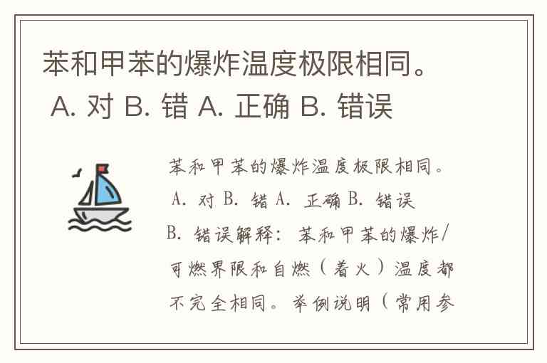 苯和甲苯的爆炸温度极限相同。 A. 对 B. 错 A. 正确 B. 错误