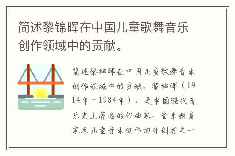 黎锦晖(1914年-1984年),是中国现代音乐史上著名的作曲家、音乐教育家及儿童音乐创作的开创者之一,他在中国儿童歌舞音乐创作领域作出了巨大的贡献。以下是他在这一领域的几项重要贡献: