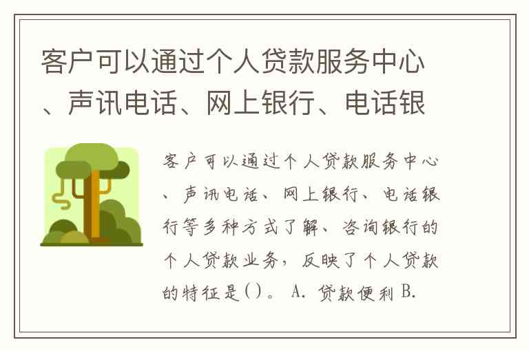 客户可以通过个人贷款服务中心、声讯电话、网上银行、电话银行等多种方式了解、咨询银行的个人贷款业务,反映了个人贷款的特征是( )。 A. 贷款便利 B. 贷款品种多、用途广 C. 还款方式灵活 D. 都不对